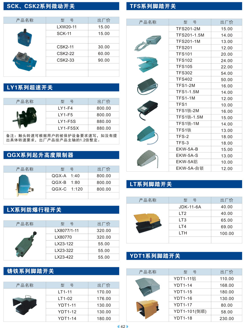 SCK、CSK2系列微動開關(guān)、LY1系列超速開關(guān)、QGX系列起升高度限制器、LX系列防爆行程開關(guān)、鑄鐵、TFS、LT、YDT1系列腳踏開關(guān)